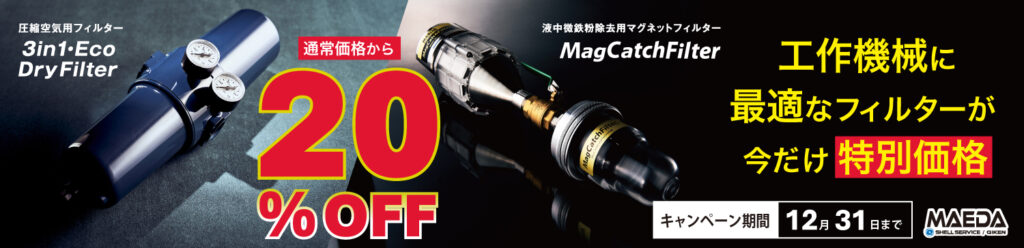 平素より 株式会社前田シェルサービス をご愛顧いただき、誠にありがとうございます。このたび、工作機械の稼働環境改善に貢献するフィルターを対象に、期間限定で 20%OFF のお得なキャンペーンを実施いたします。🗓期間:2025年10月1日~12月31日🎯対象製品:①3in1・エコ×ドライフィルター TH-20 ②マグキャッチフィルター MGCF-200/MGCF-225📄 チラシはこち